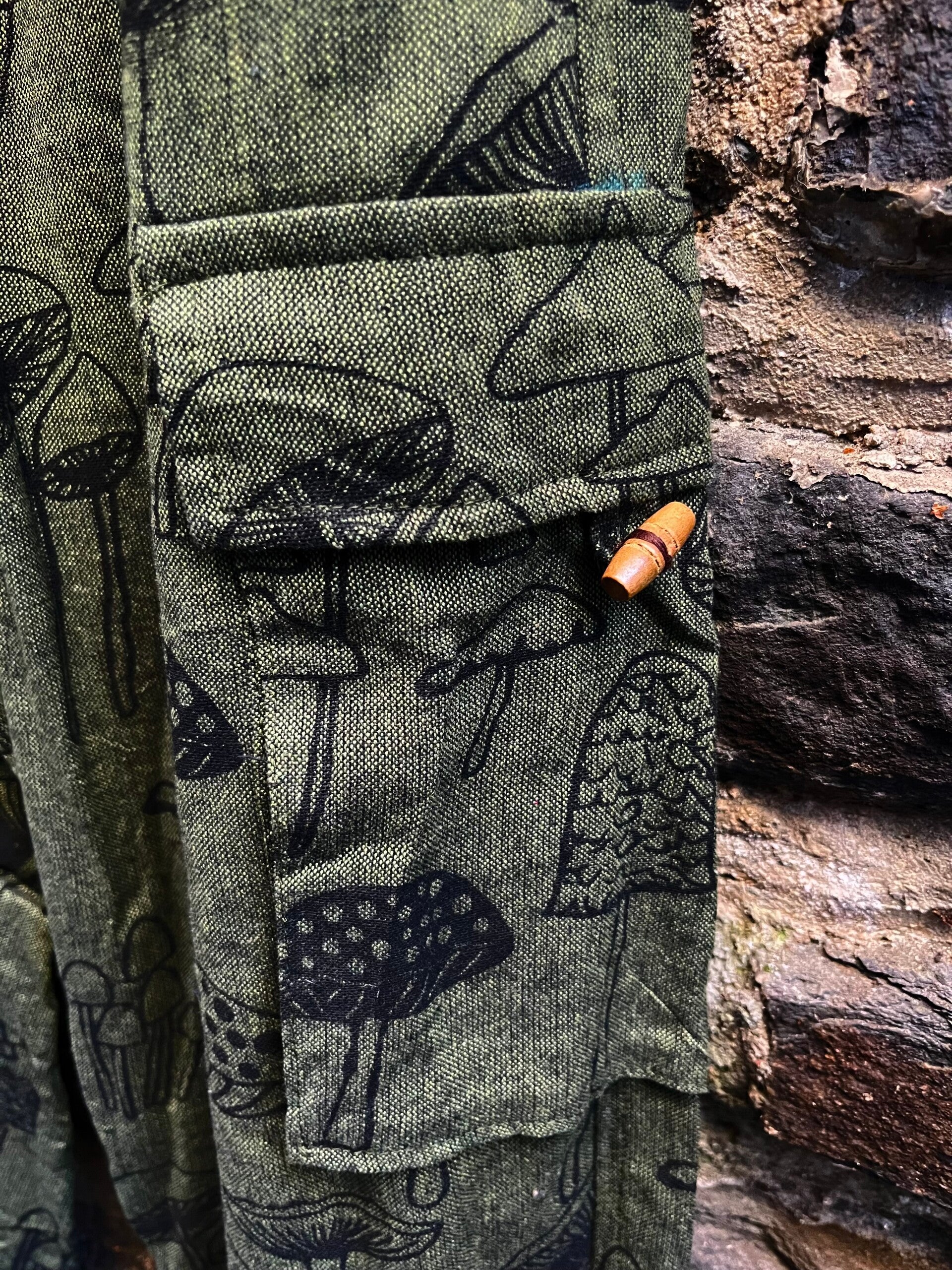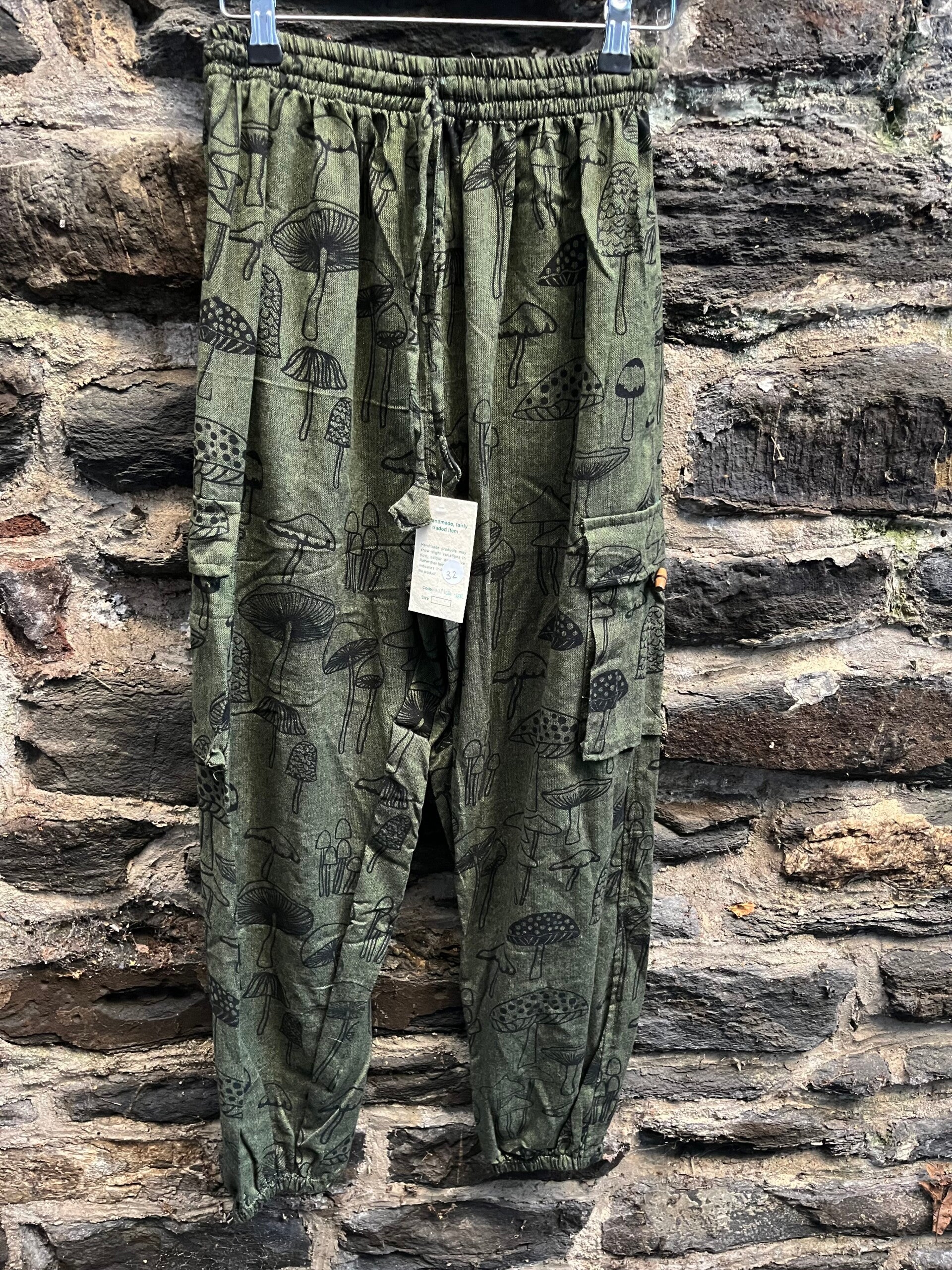 👉 one size (8/10/12) green toadstool combat trousers. Made of lightweight fabric these comfortable combat trousers have a fantastic mushroom design. They have two button up combat pockets as well as two regular pockets, plus they have an elasticated waistband and adjustable tie for extra comfort.