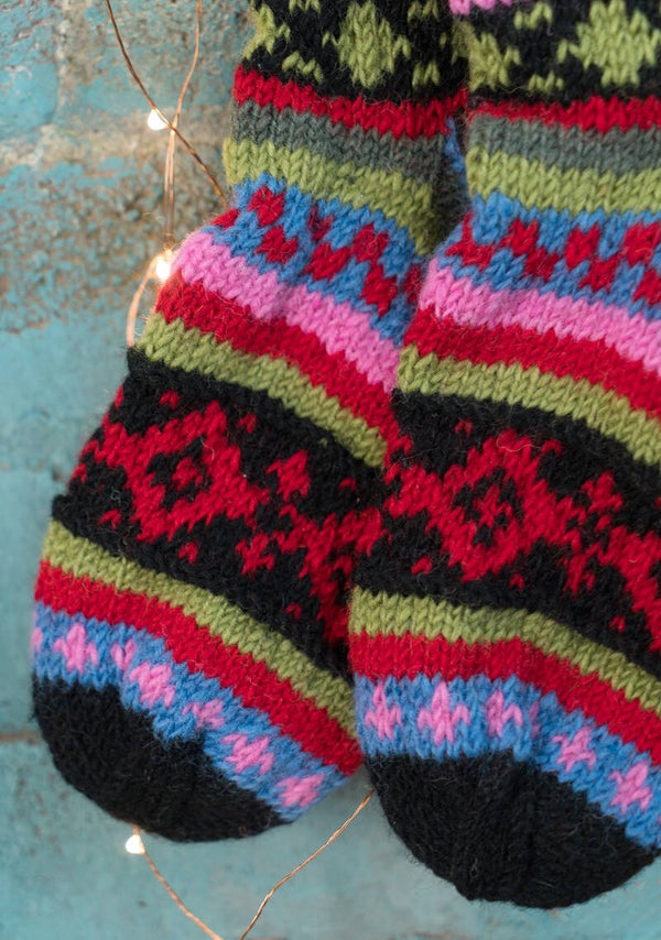 The gorgeous pure wool socks display bold bands of colour and red diamond panels against a midnight base. The distinguished design is completed by a plain toe, ribbed tri colour cuff and striped heel.